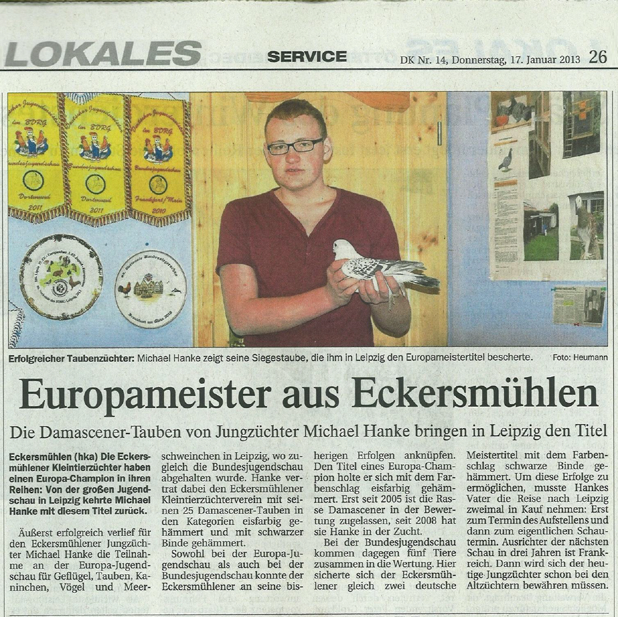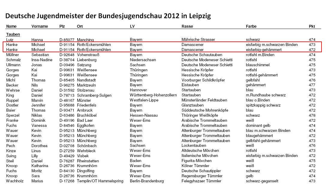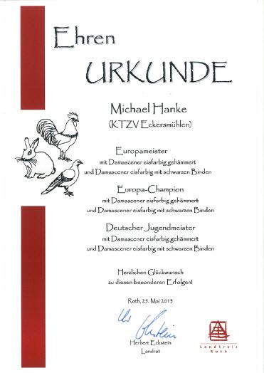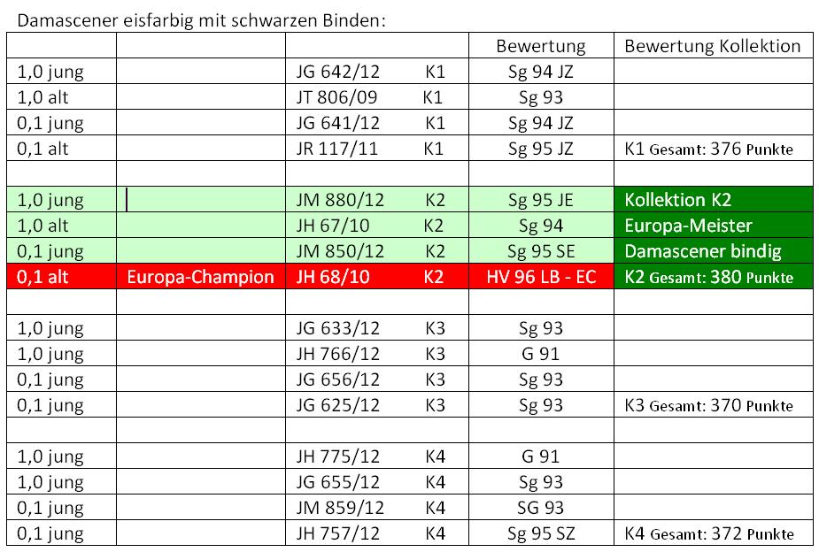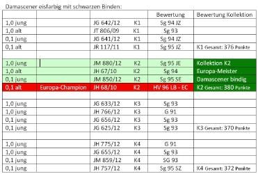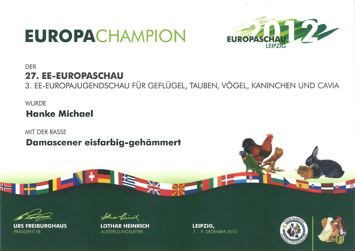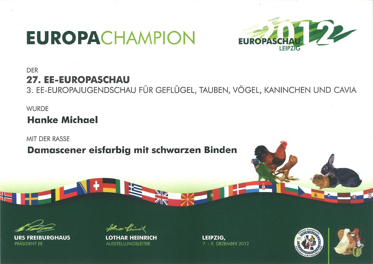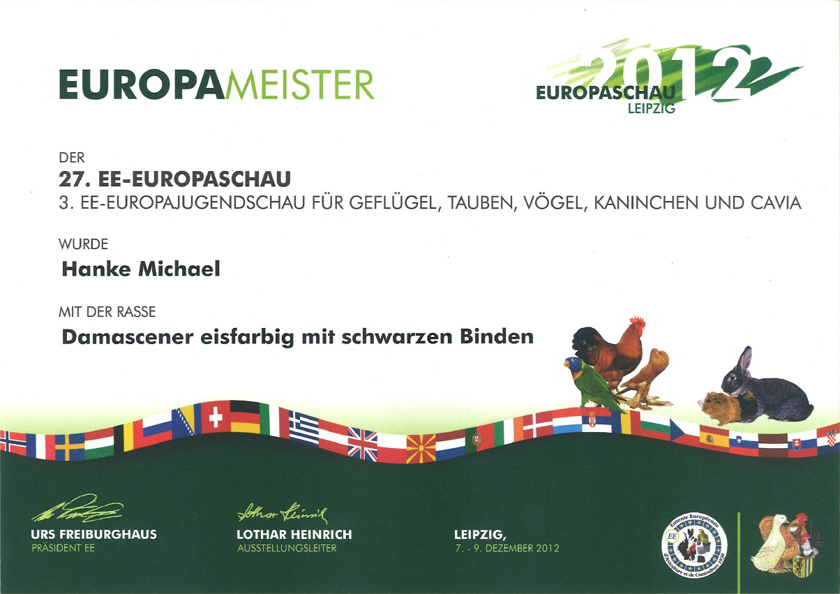 Auf der 27. Europaschau und der 49. Bundesjugendschau vom 7. - 9. Dezember 2012 in Leipzig stellte ich 25 meiner Damascener (16 Bindige und 9 Gehämmerte) zur Schau.