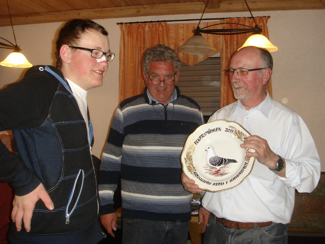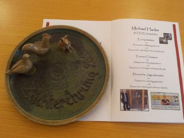 Bei einer Versammlung des Kreis-Verbandes der Geflügelzüchter bekam ich aus den Händen von Walter Gentele den Bayerischen Meister Titel und für meine Erfolge bei der Kreisschau einem handbemalten Teller überreicht. |
