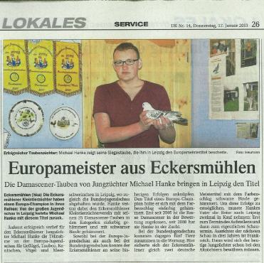 Und auf eine alte bindige Täubin bekam ich HV 96 LIPSIA-Band und ebenfalls den Titel Europachampion.