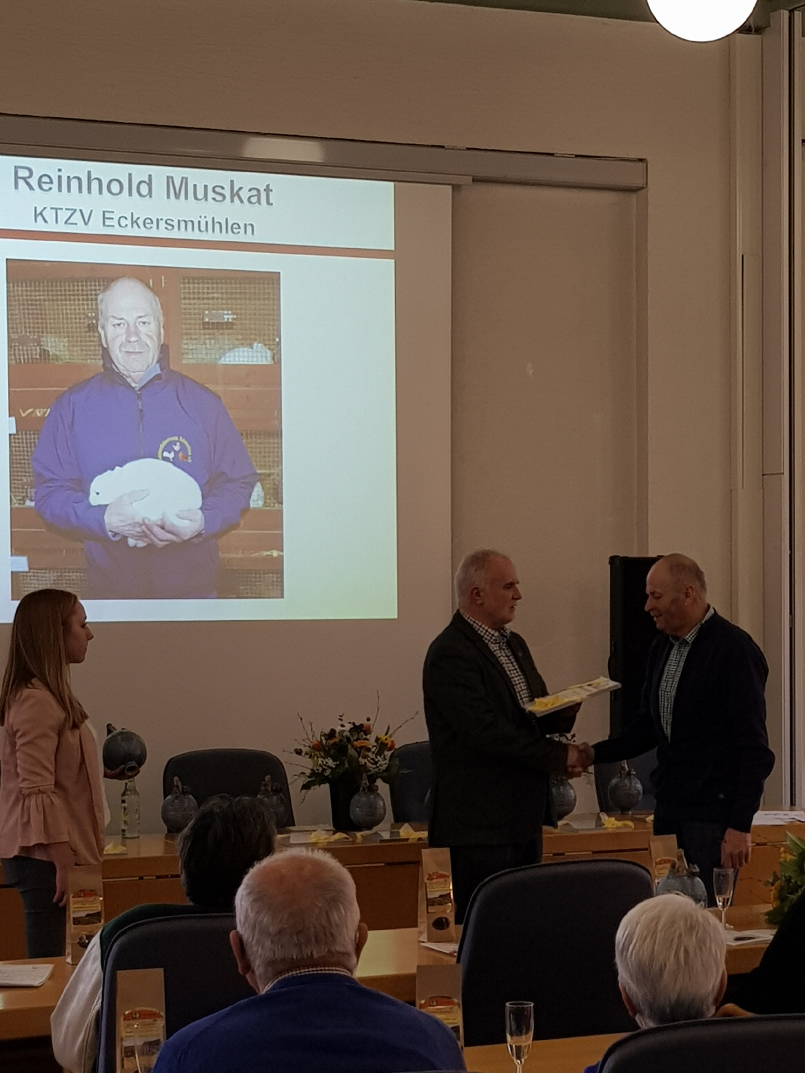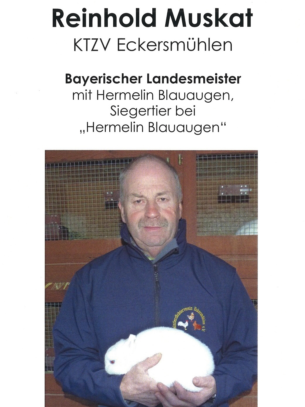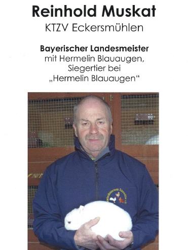 Aus unserem Verein wurde Reinhold Muskat für seinen Bayerischen Landesmeistertitel, welchen er mit "Hermelin Blauauge" auf der Landeschau der Kaninchenzüchter in Straubing errang, vom Landrat mit einer getöpferten Rosenkugel und einer Urkunde gewürdigt. Unser Kleintierzuchtverein Eckersmühlen ist sehr Stolz auf Reinhold Muskat und seine Hermelin Blauauge.