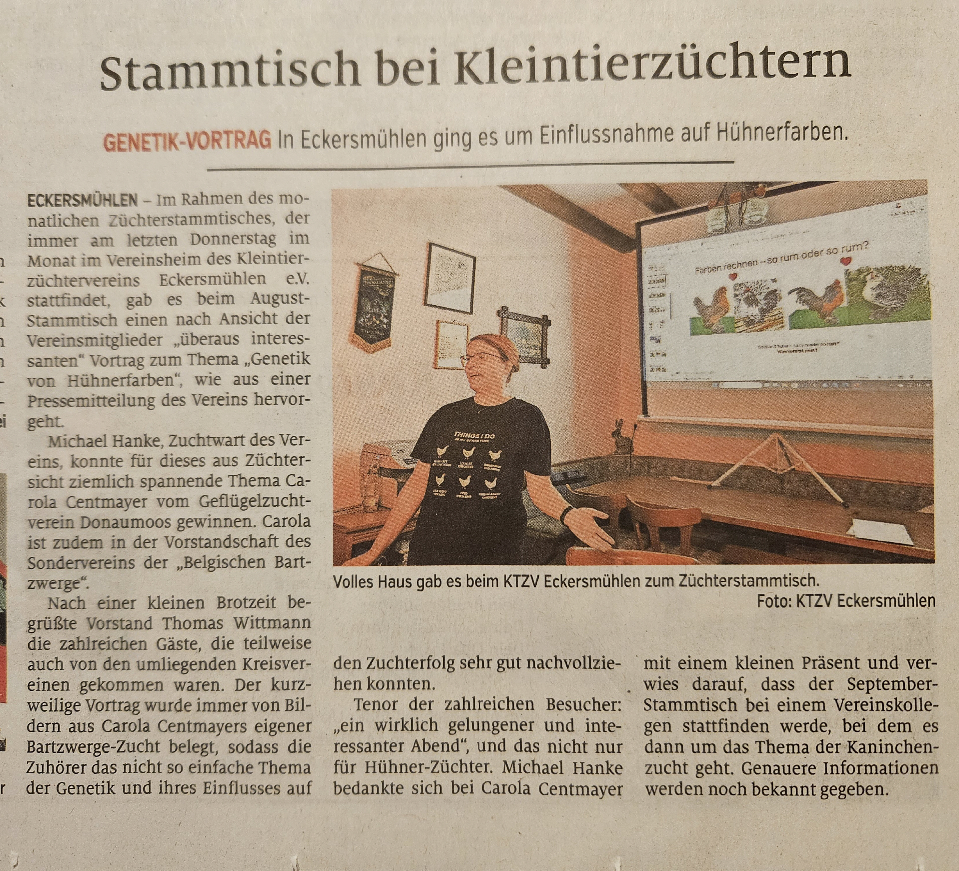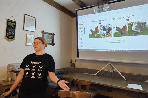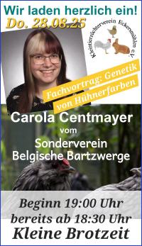 mit einem interessanten Vortrag zum Thema „Genetik von Hühnerfarben“. Unser Zuchtwart Michael Hanke konnte für dieses spannende Thema Carola Centmayer vom Geflügelzuchtverein Donaumoos gewinnen. Carola ist zudem in der Vorstandschaft vom Sonderverein der „Belgischen Bartzwerge“. Nach einer kleinen Brotzeitbegrüßte der 1.Vorstand Thomas Wittmann die zahlreichen Gäste, die teilweise auch von den umliegenden Kreisvereinen gekommen waren. Der kurzweilige Vortrag wurde immer von Bildern aus Ihrer eigenen Bartzwerge-Zucht belegt, so daß die Zuhörer das nicht so einfache Thema der Genetik sehr gut nachvollziehen konnten. Tenor der zahlreichen Besucher: „Ein wirklich gelungener und interessanter Abend“, und das nicht nur für Hühner-Züchter. Michael Hanke bedankte sich bei Carola Centmayer mit einem kleinen Präsent.