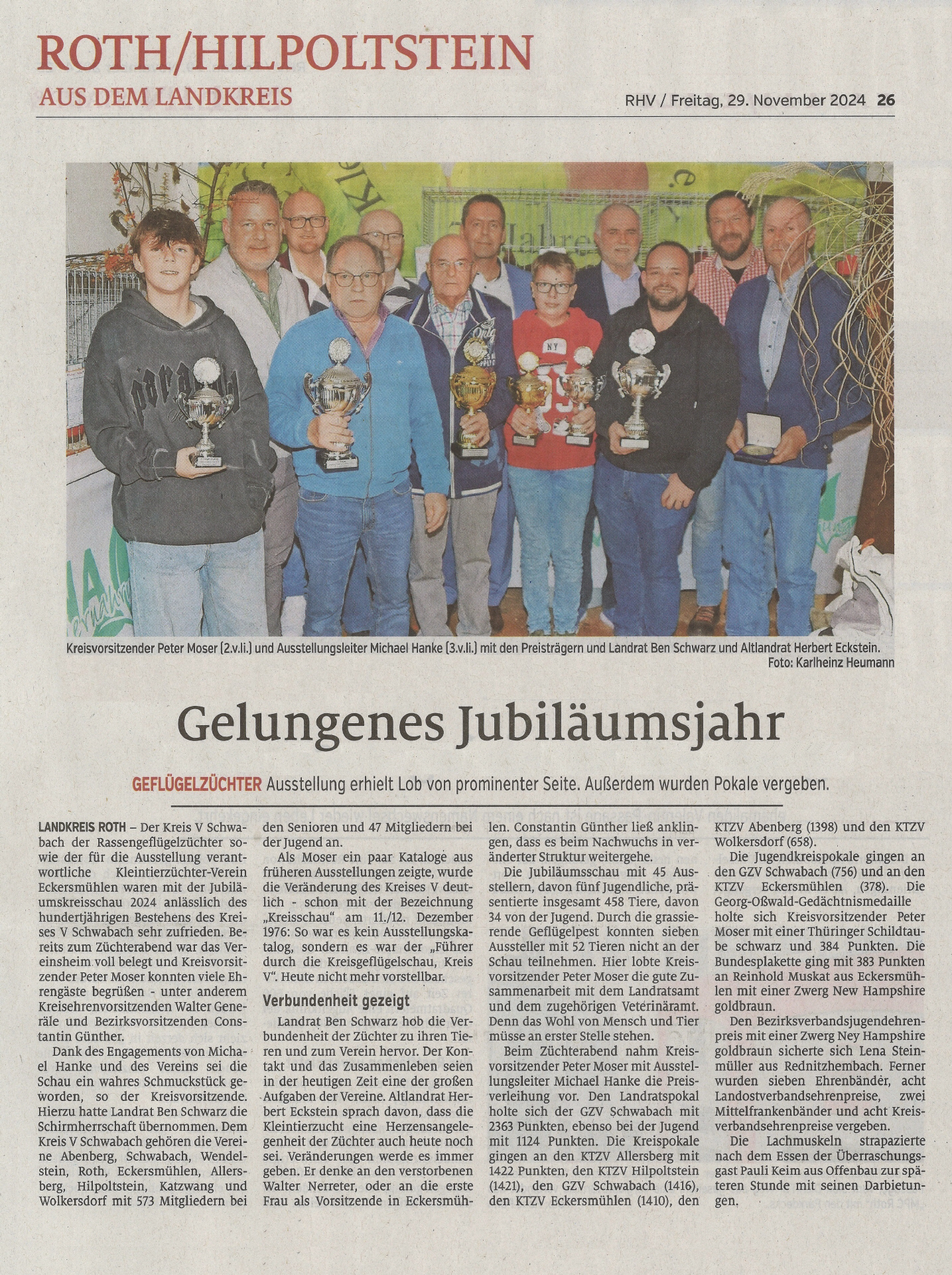 In einer Feierstunde im Sitzungssaal des Kreistages im Landratsamt Roth würdigte unser neuer Landrat Ben Schwarz erfolgreiche Kleintierzüchter aus dem Landkreis. Dieses Jahr bereits zum 11. Mal.