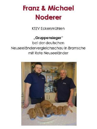 Aus unserem Verein wurde die Zuchtgemeinschaft Noderer für deren Leistung bei der deutschen Neuseeländervergleichsschau in Bramsche geehrt: "Gruppensieger" bei den Roten Neuseeländern. Unser Kleintierzuchtverein Eckersmühlen e.V. ist sehr Stolz auf Franz und Michael Noderer.