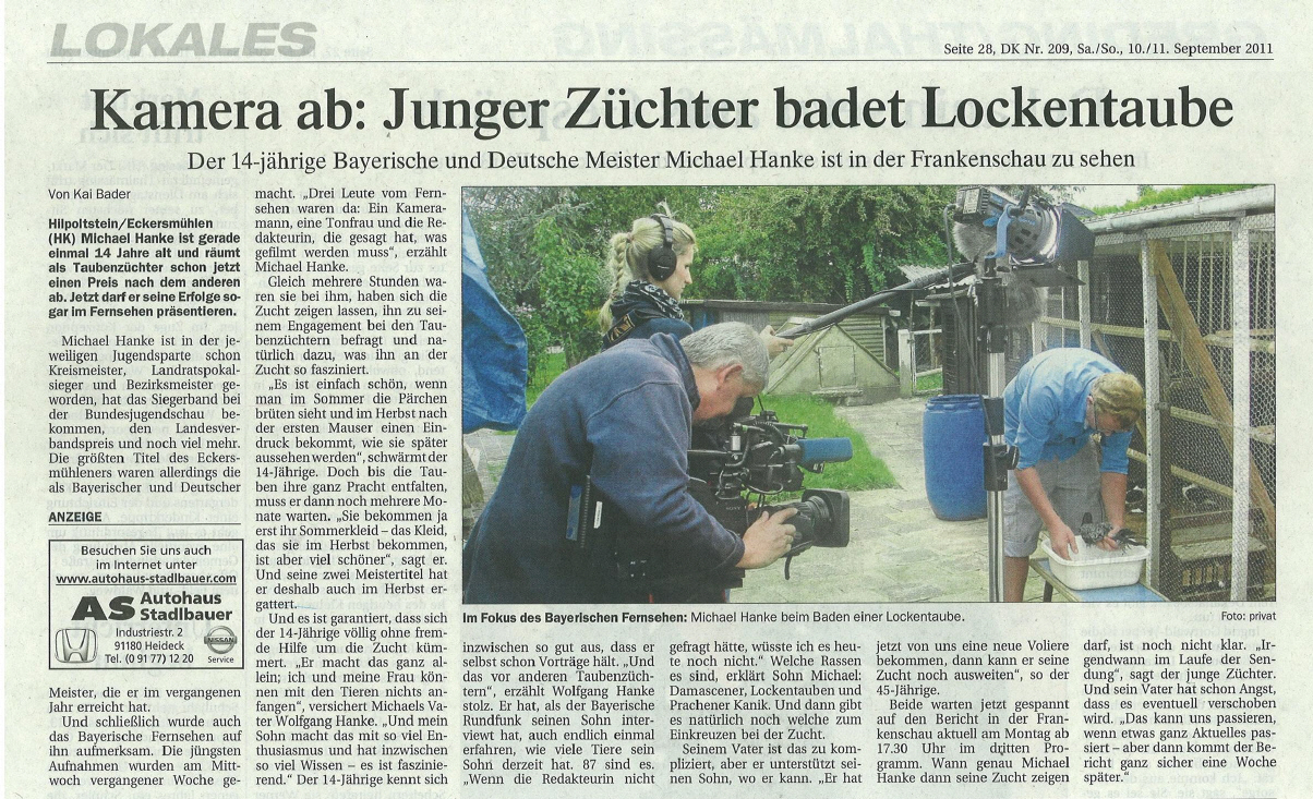 Am Montag, den 12.09.2011 um 17.30 Uhr war der Beitrag über meine Lockentauben im